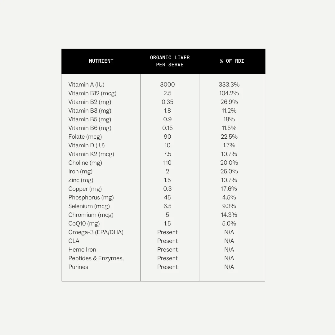 Organic Liver provides a comprehensive blend of key vitamins + minerals to help fill nutrient gaps and support the foundation for health and energy.